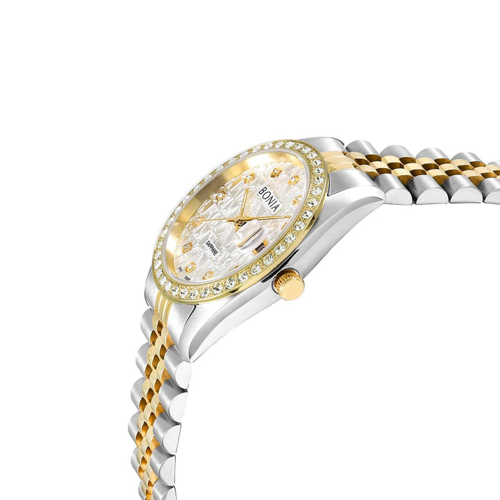 36mm IP silver stainless steel case IP gold bezel embellished with 40pcs fine crystal Silver monogram printed dial with IP gold hands 11pcs fine crystals set as hour markers 20mm two...