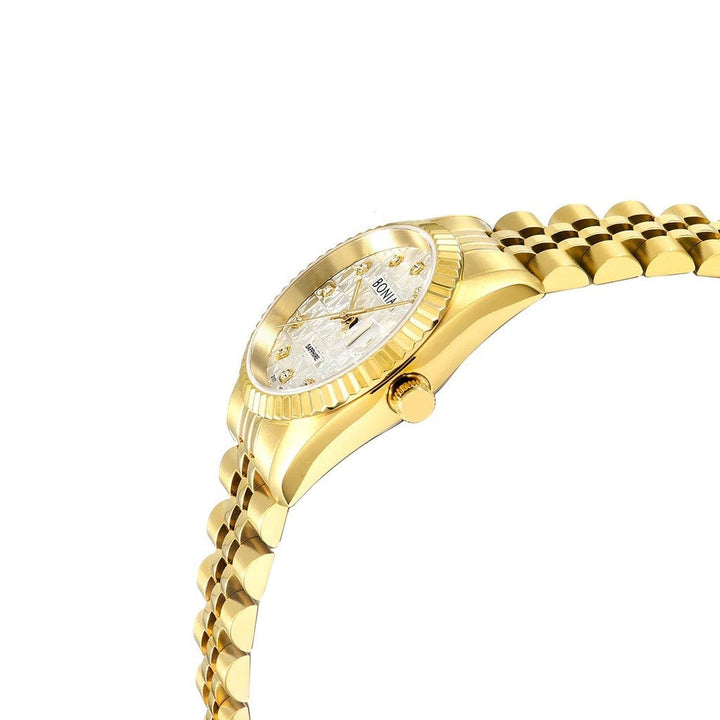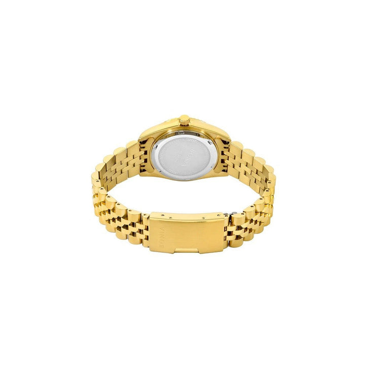 32mm IP gold stainless steel case and bezel Silver monogram printed dial with IP gold hands 11pcs fine crystals set as hour markers 17mm IP gold stainless steel bracelet Japanese quartz...