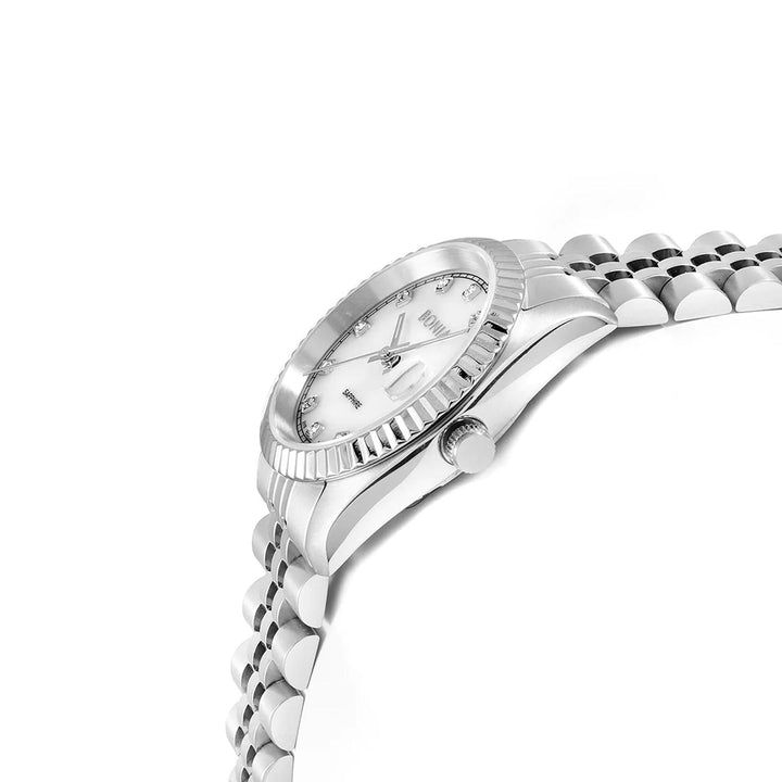32mm IP silver stainless steel case and bezel White mother of pearl dial with IP silver hands 11pcs fine crystals set as hour markers 17mm IP silver stainless steel bracelet Japanese...