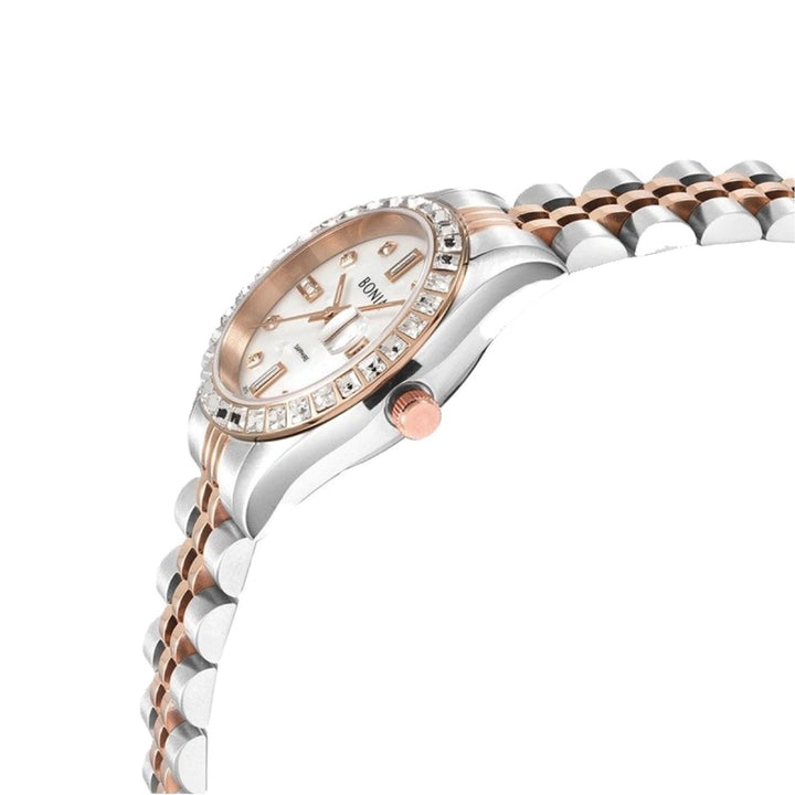29mm IP silver stainless steel case IP rose gold top ring embellished with 36pcs fine crystals White mother of pearl dial with IP rose gold hands 11pcs fine crystals set as...