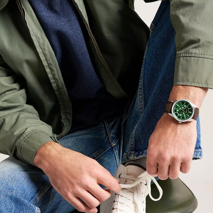 Sku: FS6137 Case Size: 42MM Movement: Quartz Multifunction Platform: PEARSON Strap Material: Leather Strap Color: Brown Case Water Resistance: 5 ATM Case Material: Stainless Steel Case Color: Black Dial Color: Green Strap Fashion Color: Brown Interchangeable Compatibility: 22MM Strap Width: 22MM Closure: Single Prong Strap...
