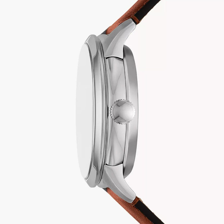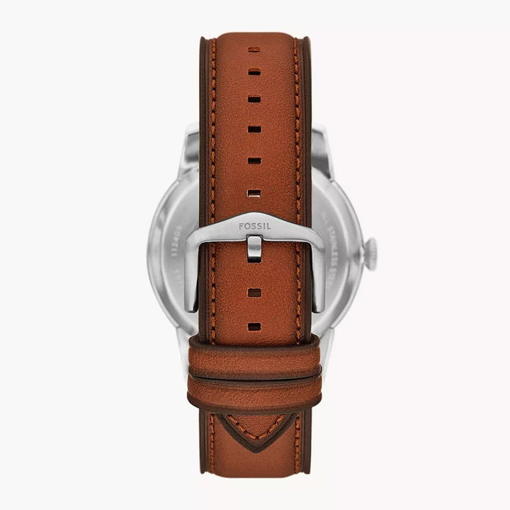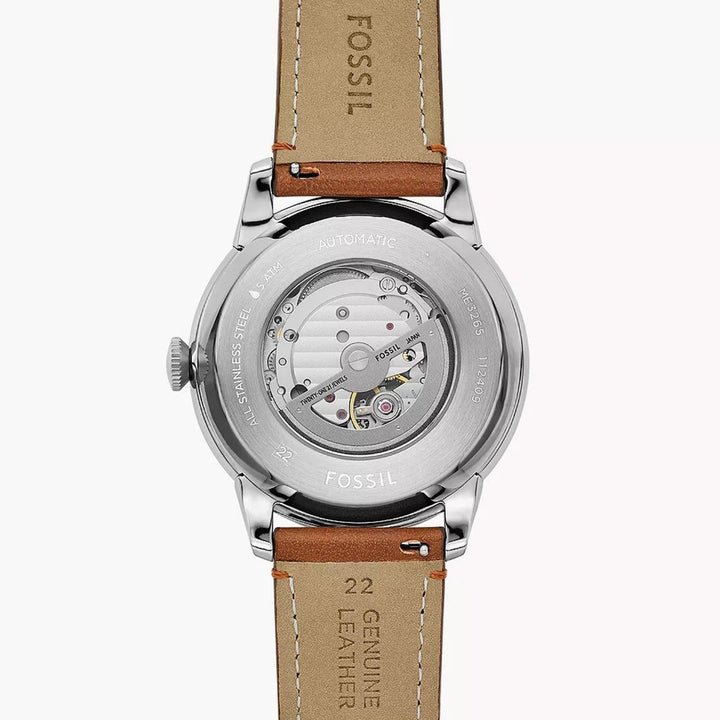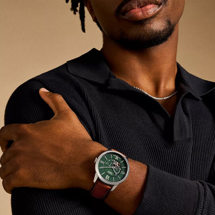 The Townsman’s traditional open heart dial offers a glimpse of its precision Japanese automatic movement in action. Its centerpiece—the balance wheel—is constantly spinning back and forth, bringing the watch to life. Fossil leather products support responsible manufacturing via the Leather Working Group.