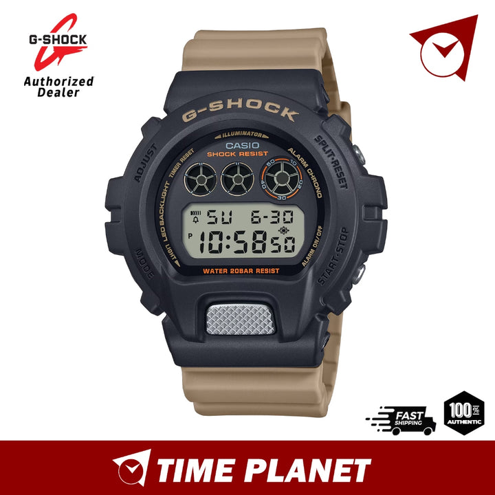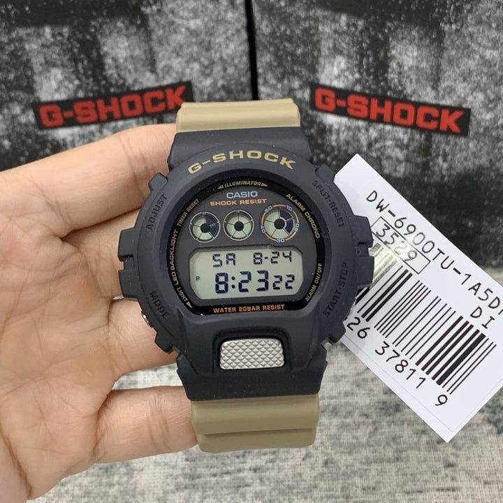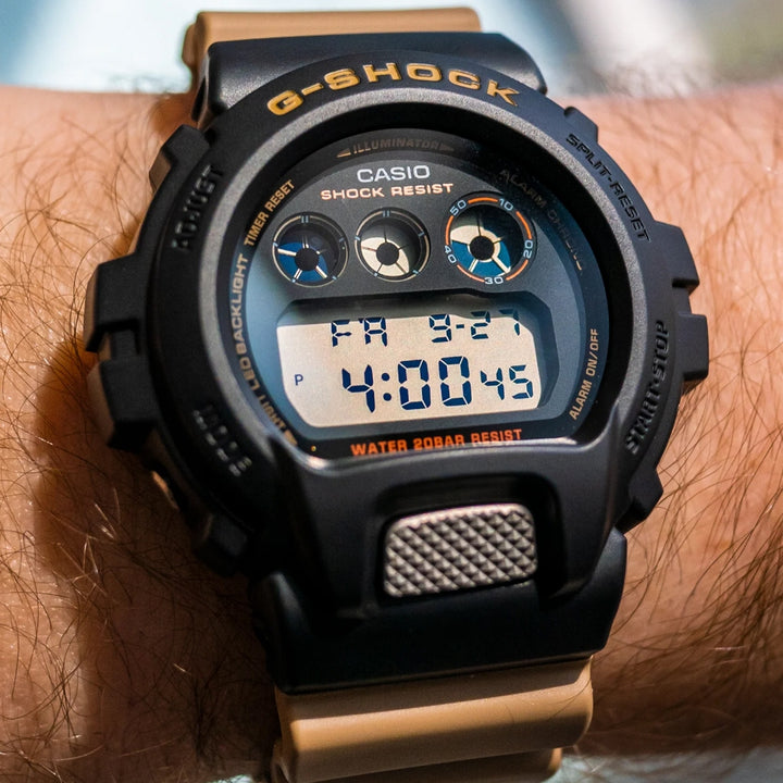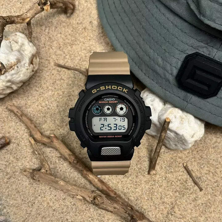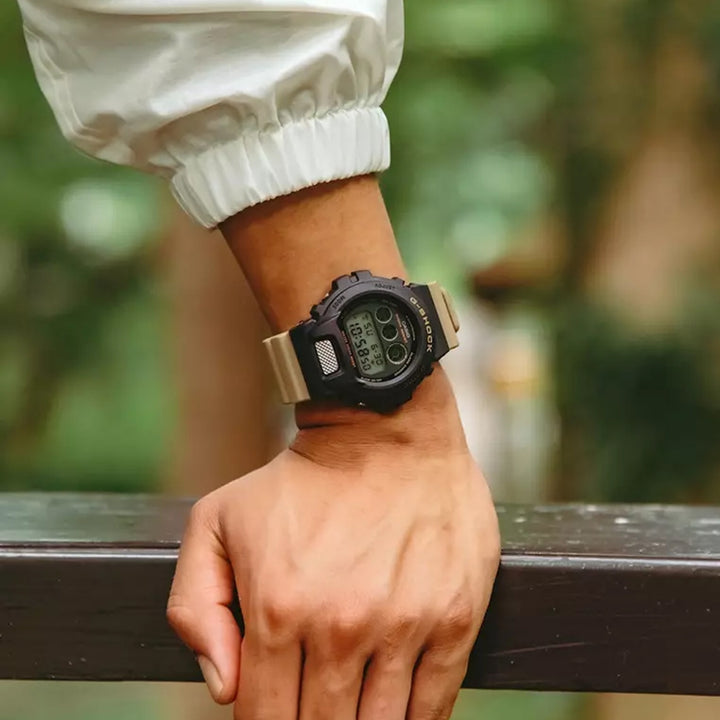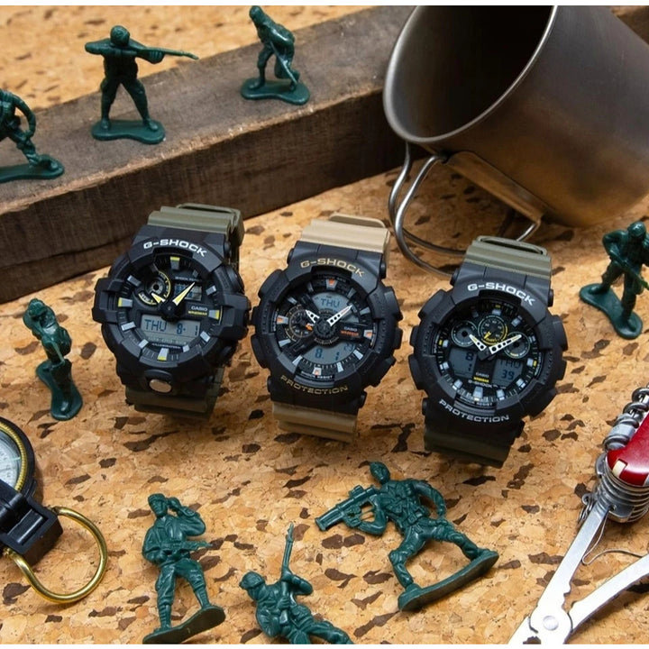 Utilitarian practicality, savvy style — all with G-SHOCK functionality and toughness.Pairing a black watch face with a band in beige or olive green, the two-tone utility color line evokes the functional look of a great piece of kit.Choose from five base models: the DW-6900 with iconic triple graph or the GA-700 with large case, both of which feature a metal front button with anti-slip finish; or the large-case designs of the GX-56, GA-100, and GA-110.