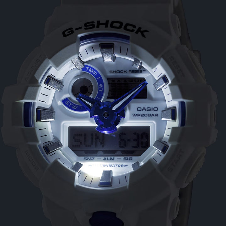 Take your inspiration from the summer seas, with the white and blue G-SHOCK. The watch’s blue phosphorescent face glows magically at night, evoking the shimmer of bioluminescent plankton floating in the sea. Paired with a white and blue color scheme, the design beautifully captures the beach’s dynamic transformation from the brilliance of the daylight sun to soft nighttime hues. Shimmery sea-inspired styles flow easily from casual settings to work situations.