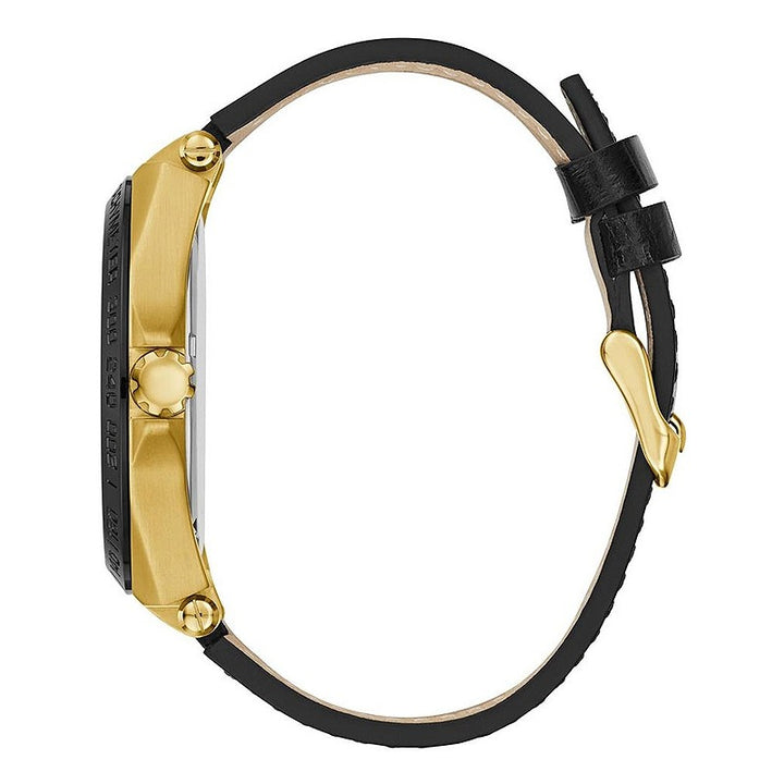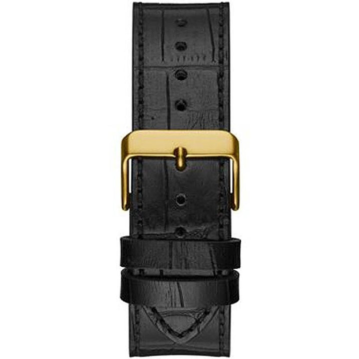 Features Cases:Stainless Steel Case colour:Gold Clasp Type:Pin Buckle Dial Color:Black Packaging:Box and papers Strap Color:Black Movement:Quartz (Battery) Water Resistance:5 ATMs Strap:Leather Case Width:46 Glasses:Mineral Functions:Second, Minute, Hour, Day & Date Gender:Male