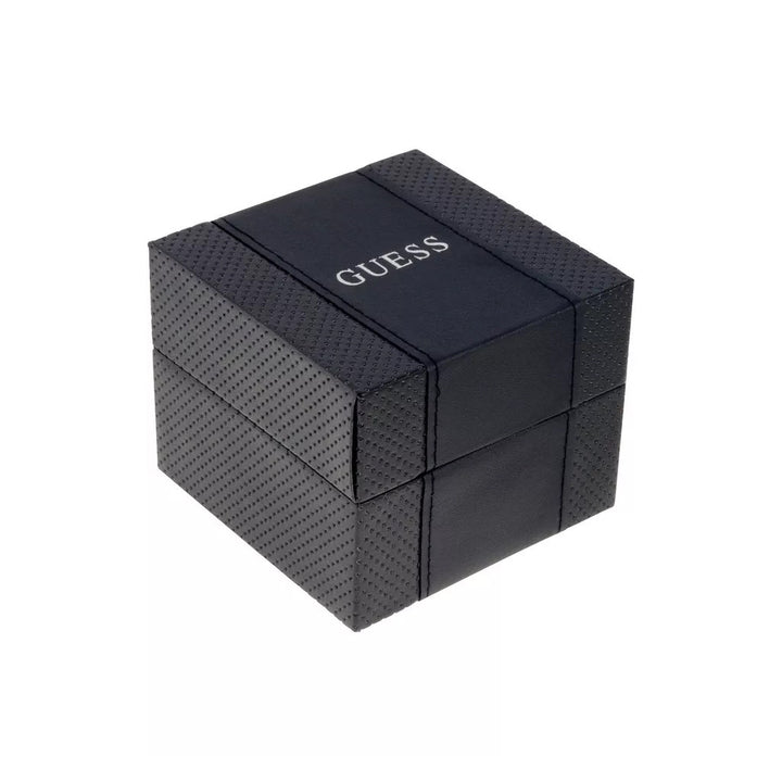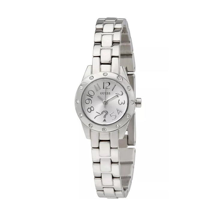 Silver-tone stainless steel case with a silver-tone stainless steel bracelet. Fixed silver-tone stainless steel bezel. Silver dial with silver-tone hands and Arabic numeral hour markers. Dial Type: Analog. Quartz movement. Solid case back. Case size: 23 mm. Round case shape. Band width: 10 mm. Functions: hour, minute, second. Dress watch style. Guess Darling Silver Dial Ladies Watch W0307L1.