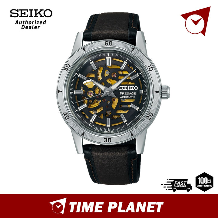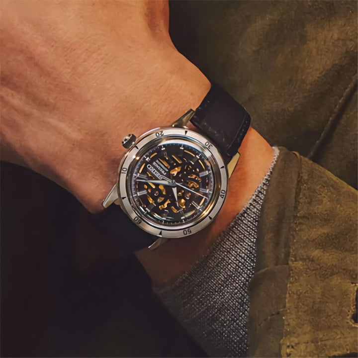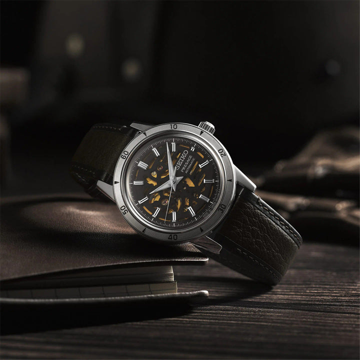 Seiko automatic men's watch, Presage Style 60's model, combining elegance and durability with a bold character. The watch features a finely crafted left side, offering a captivating view of the balance...