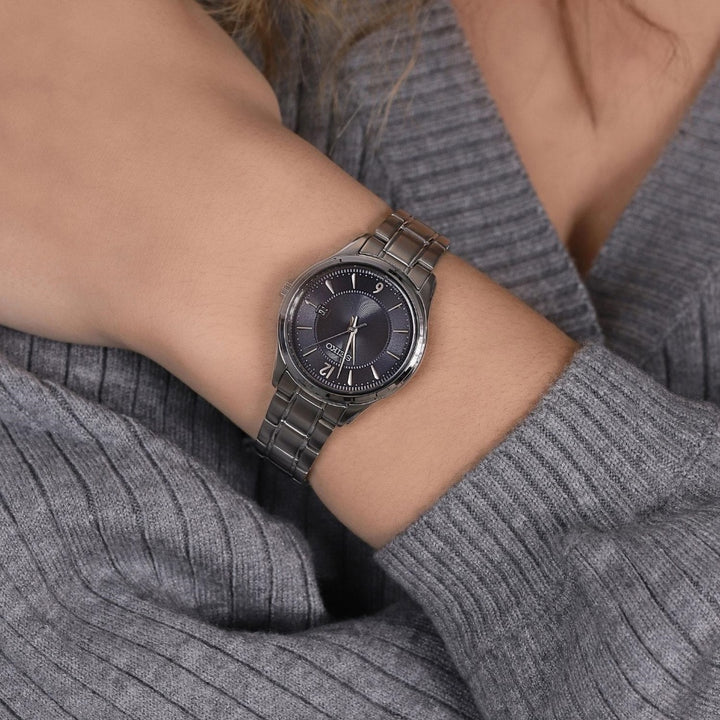 This Seiko watch has a stainless steel case 29 mm in diameter and is fitted with a metal strap. Inside the case lies a Seiko movement and the watch features a Sapphire crystal. The watch is 10 ATM. This means the watch is suitable for swimming.
