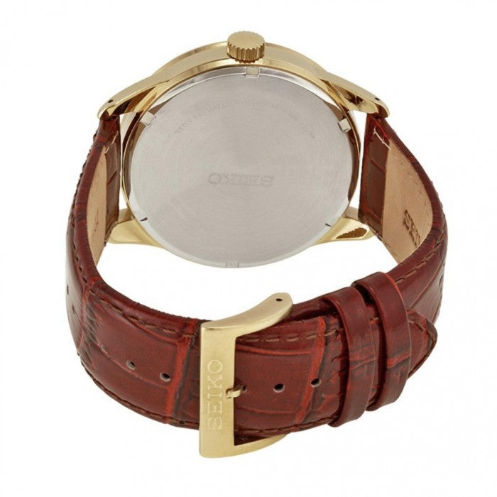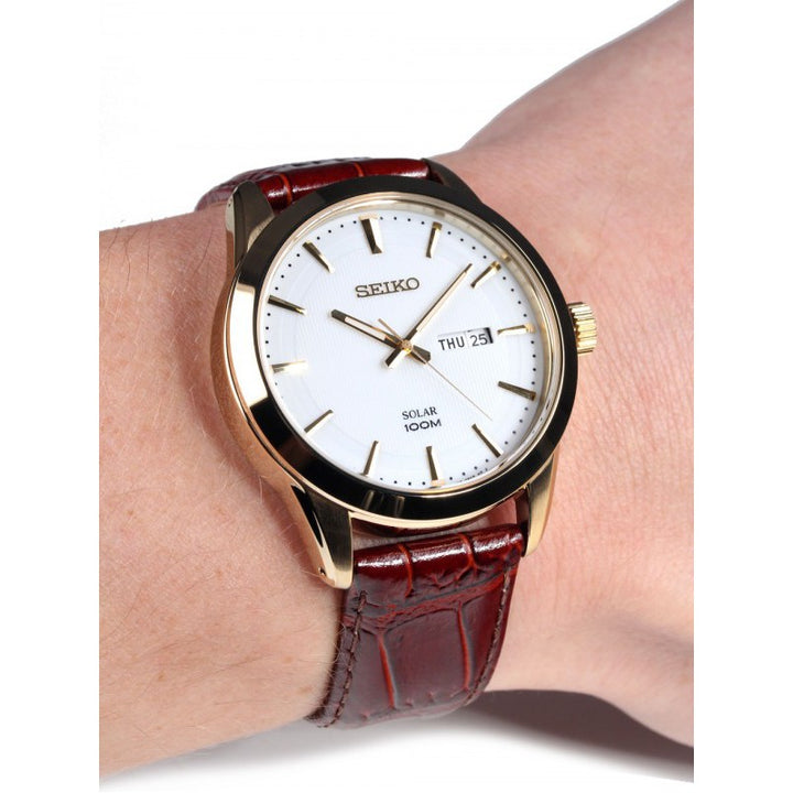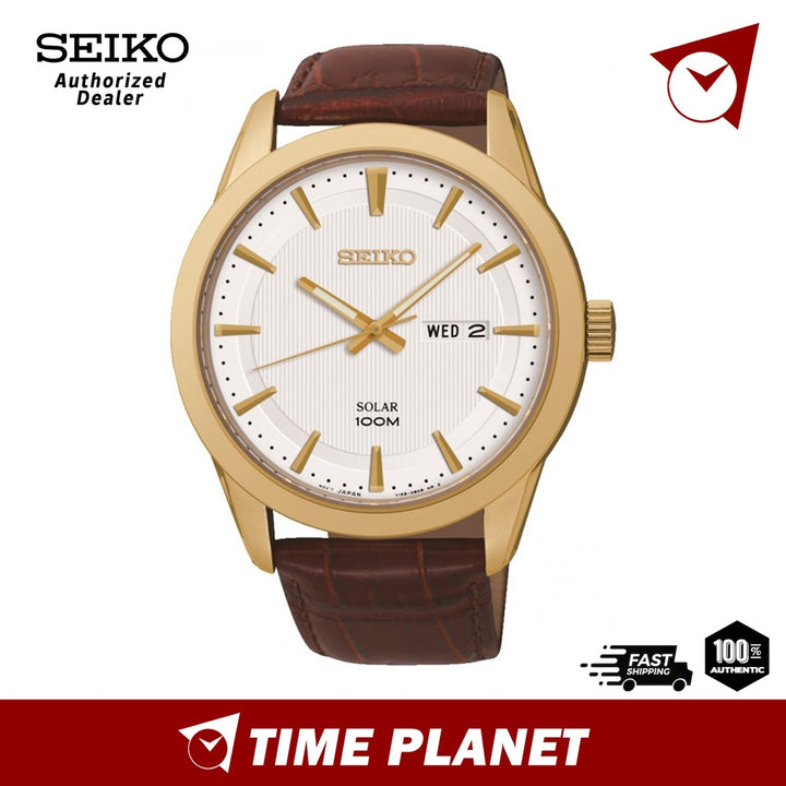 Specifications: Seiko SNE366P2 Mens Classics Solar Power BROWN Leather Watch. Stainless steel case. Seiko Genuine BROWN Leather Strap. Japan Made Solar Powered Quartz movement. Screw Case Back. WHITE dial with GOLD...