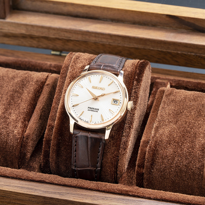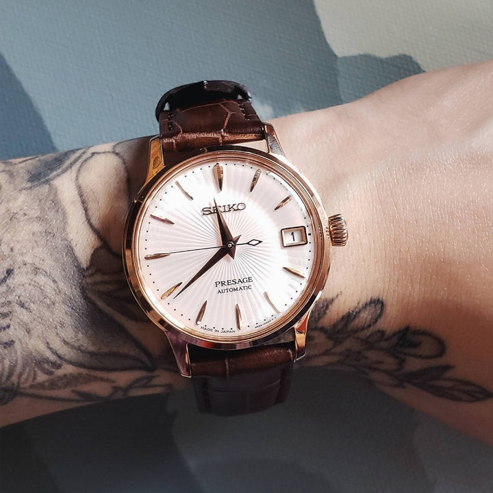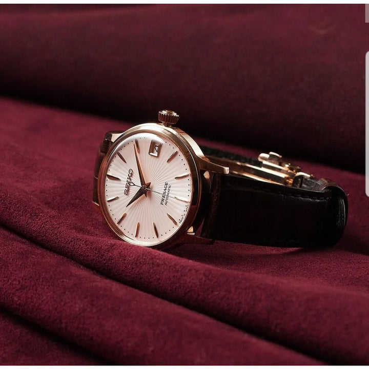 Seiko SRP852J1 Ladies Presage Cocktail Automatic Rose Gold Case Brown Leather Strap Watch. Made in Japan. Automatic movement with manual winding capacity. Caliber: 4R35. 23 jewels. Approx. 41 hours. Polished rose gold stainless steel case. Genuine Brown calf leather strap. Three-fold clasp with push button release buckle. Warm rose gold dial with rose gold-tone hands and indexes. Date display at 3 o’clock small counter. See-through case back. Box-shaped hardlex crystal. Stop seconds hand function. Water resistant to 50 meters. Approximate case diameter: 33.8mm. Approximate case thickness: 11.3mm.