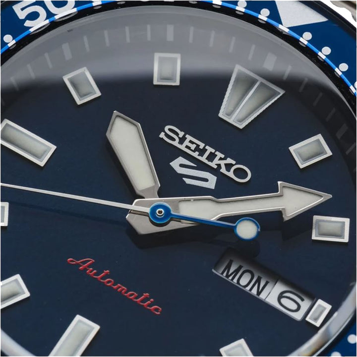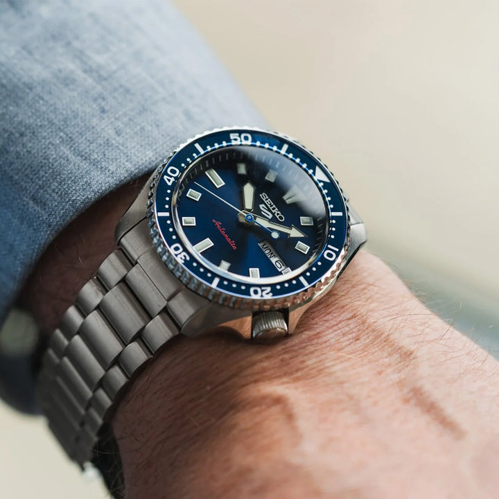 Seiko introduces the new design of the SKX line, a refined evolution and faithful to the iconic model of the archive. The bezel with a polished glass insert harmoniously matches the blue sunray dial, enriched by applied indexes and refined hands for a brighter and more premium finish. The bezel in the same shade of blue further enhances the sporty aesthetic of the watch. The newly designed bracelet, with rounded links, gives the timepiece an elegant and modern touch, completing a reinterpretation that combines contemporary style with original DNA.
