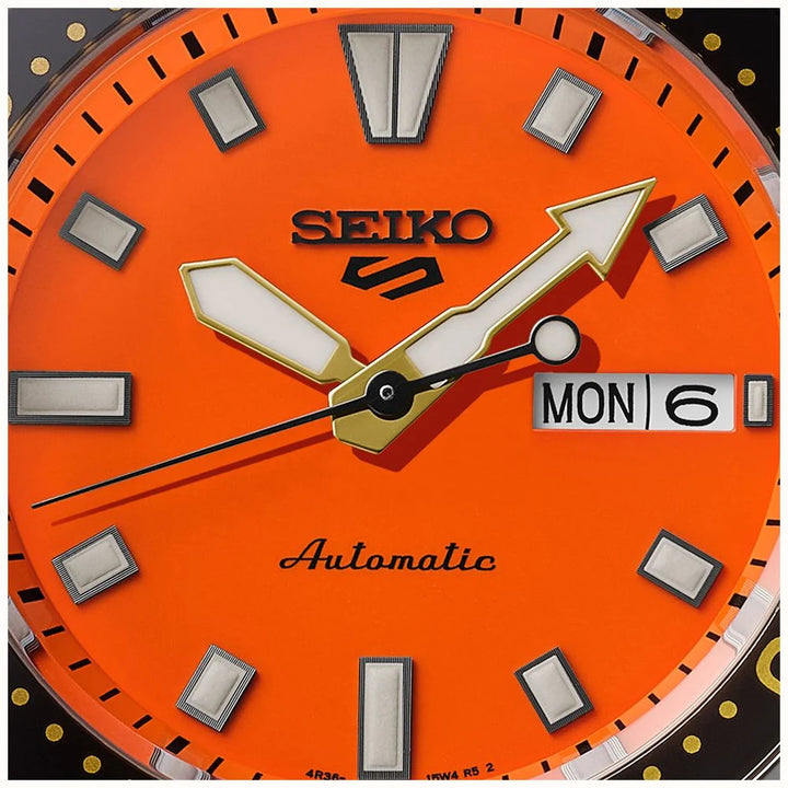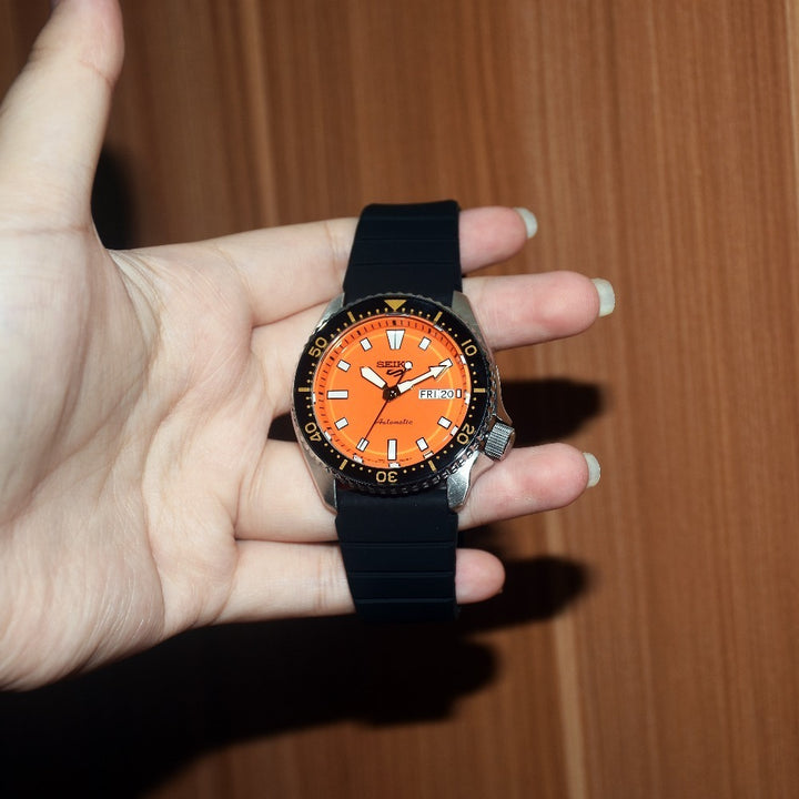 Seiko introduces the new design of the SKX line, a refined evolution and faithful to the iconic model of the archive. The bezel with a polished glass insert harmoniously matches the orange sunray dial, enriched by applied indexes and refined hands for a brighter and more premium finish. The bezel in the same shade of black further enhances the sporty aesthetic of the watch.