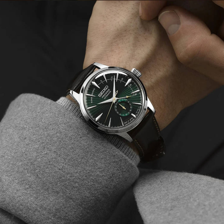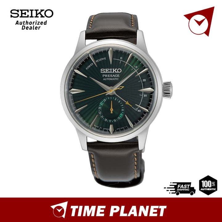 This Seiko watch has a stainless steel case 40.5 mm in diameter and is fitted with a leather strap. Inside the case lies a Seiko movement and the watch features a Hardlex crystal crystal.The watch is 5 ATM. This means the watch is suitable for showering. The watch comes with 2 Year Warranty.