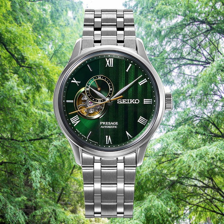 SSA463J1 from the Japanese Zen Garden Series is inspired by traditional Japanese rock gardens, featuring a deep gold three-dimensional pattern and a glossy dial. The curved hands and open-heart display add elegance, showcasing Seiko's craftsmanship and the in-house automatic calibre. This watch embodies timeless looks and precise mechanical timekeeping with a distinctly Japanese aesthetic.