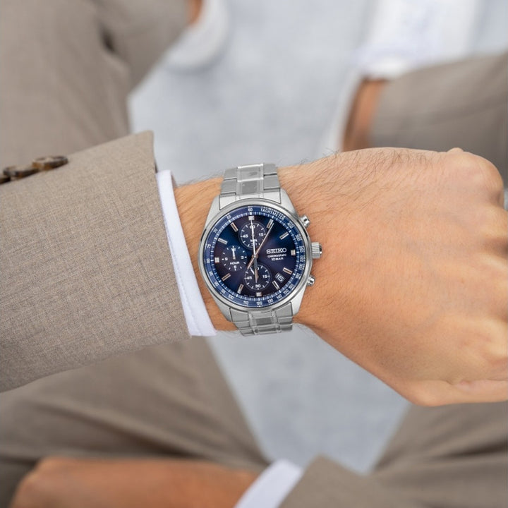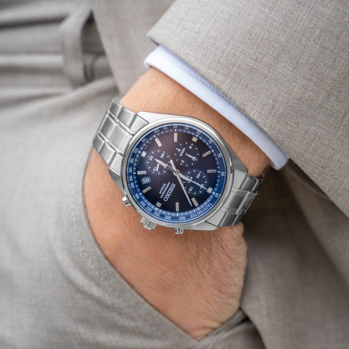 Seiko SSB377P1 is an amazing and very impressive Gents watch. Case is made out of Stainless Steel and the Blue dial gives the watch that unique look. The features of the watch include (among others) a chronograph. In regards to the water resistance, the watch has a water resistance of 100 metres. This makes it suitable for swimming, but not high impact water sports.