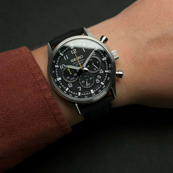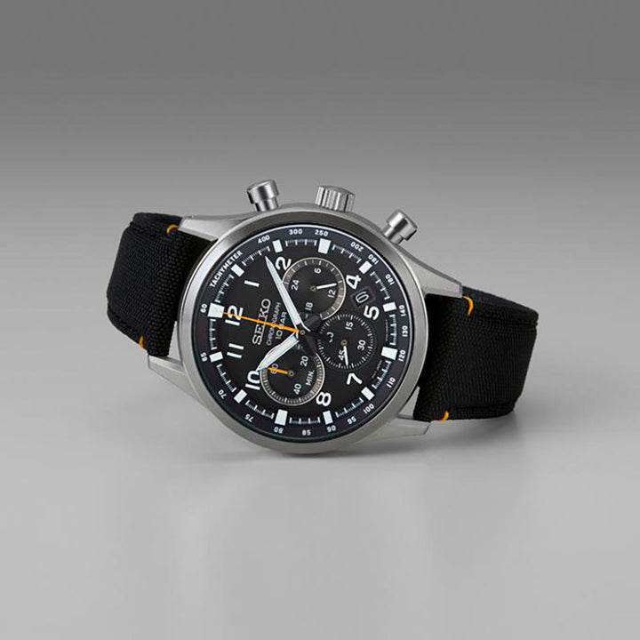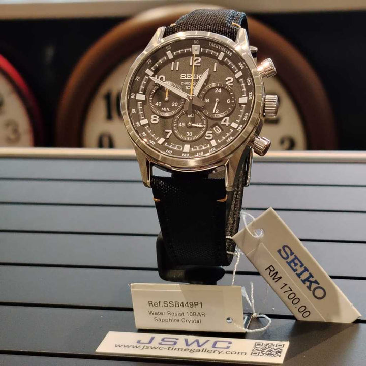 Silver-tone stainless steel case with a black nylon strap. Fixed silver-tone stainless steel bezel. Black dial with silver-tone hands and index hour markers. Minute markers around the outer rim. Dial Type: Analog. Luminescent hands and markers. Date display between 4 and 5 o'clock position. Chronograph - three sub-dials displaying: 60 minute, 60 second, 24 hour. Seiko Caliber 8T63 quartz movement. Scratch resistant Hardlex crystal. Solid case back. Round case shape, case size: 43 mm, case thickness: 11.6 mm. Band width: 22 mm. Buckle clasp. Water resistant at 100 meters / 330 feet. Functions: chronograph, date, hour, minute, second. Sport Series. Sport watch style. Watch label: Japan Movt. Seiko Sport Chronograph Quartz Black Dial Men's Watch SSB449P1.