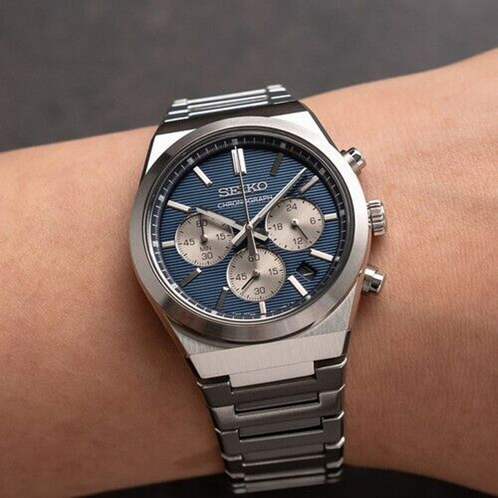 Silver-tone stainless steel case and bracelet. Fixed silver-tone stainless steel bezel. Blue dial with silver-tone hands and index hour markers. Minute markers around the outer rim. Dial Type: Analog. Date display between 4 and 5 o'clock position. Chronograph - three sub-dials displaying: 60 second, 60 minute and 24 hour. Seiko Caliber 8T63 quartz movement. Scratch resistant sapphire crystal. Solid case back. Round case shape, case size: 40 mm, case thickness: 11.5 mm. Band width: 20 mm. Deployment with push button release clasp. Water resistant at 100 meters / 330 feet. Functions: chronograph, date, hour, minute, second. Sport Series. Sport watch style. Watch label: Japan Movt. Seiko Sport Chronograph Quartz Silver Dial Men's Watch SSB451P1.