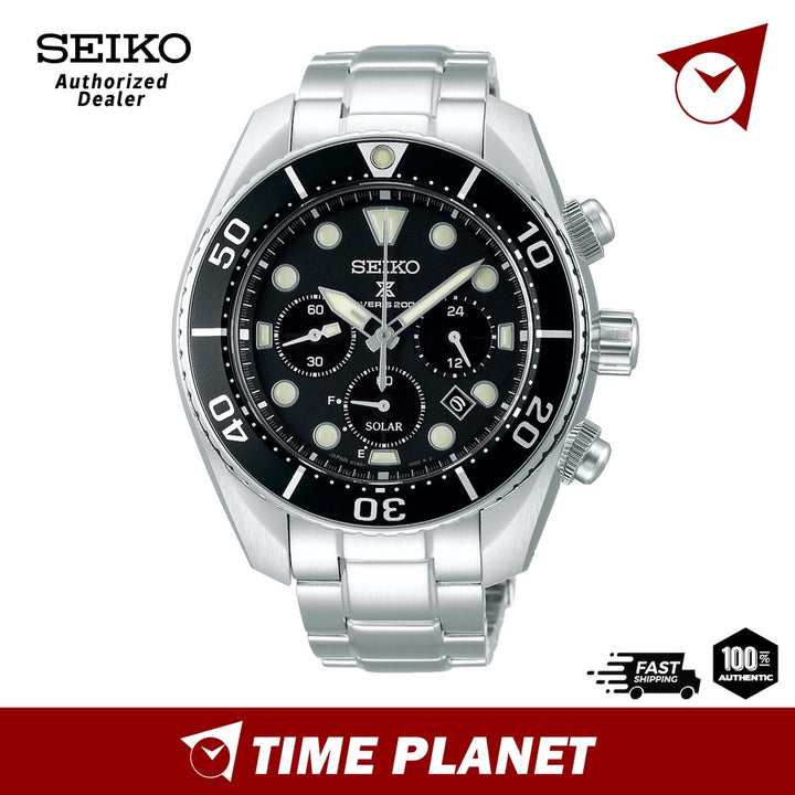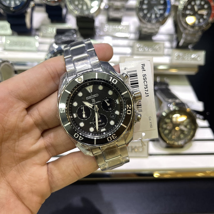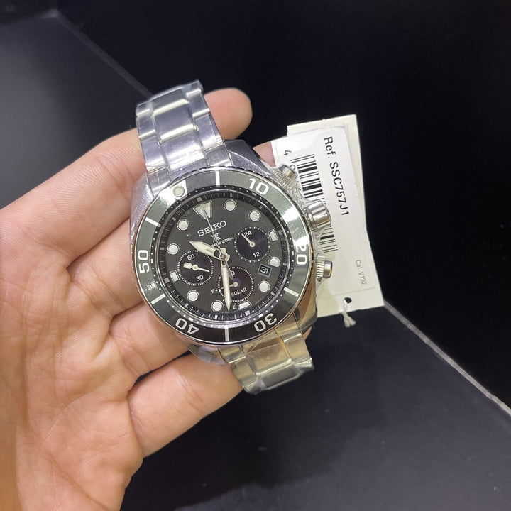 All new Seiko Sumo Black Solar Chronograph Diver watch - the SSC757J1. The Seiko Prospex SSC757J1 has a stunning black sunburst face that shines beautifully in the light. Silver color indexes and pointers are strongly luminous ( lumibrite ), so that they glow in the dark.