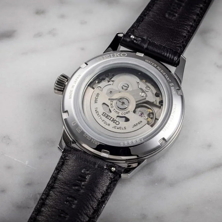 Equipped with a 4R34 caliber, this timepiece has a power reserve of approximately 41 hours with a 24-hour hand (dual time display function), and a stop second hand function with a date display.