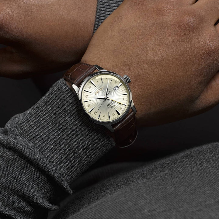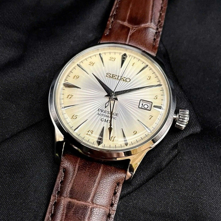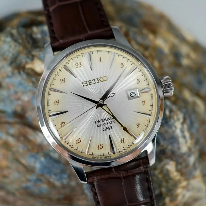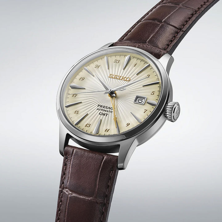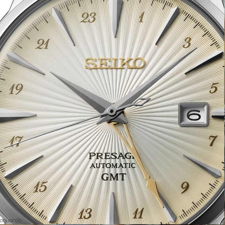 Tell time seemlessly during your travels with the Seiko Presage Cocktail Time #SSK041J1.