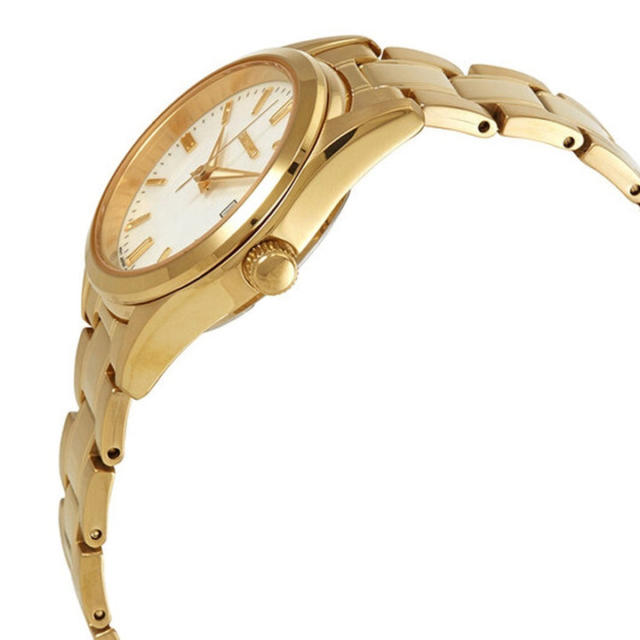 Gold-tone stainless steel case and bracelet. Fixed gold-tone stainless steel bezel. Silver dial with luminous gold-tone hands and index hour markers. Minute markers around the outer rim. Dial Type: Analog. Luminescent...