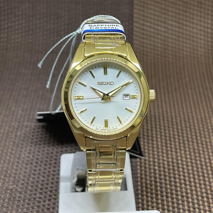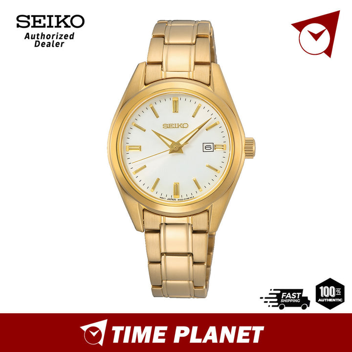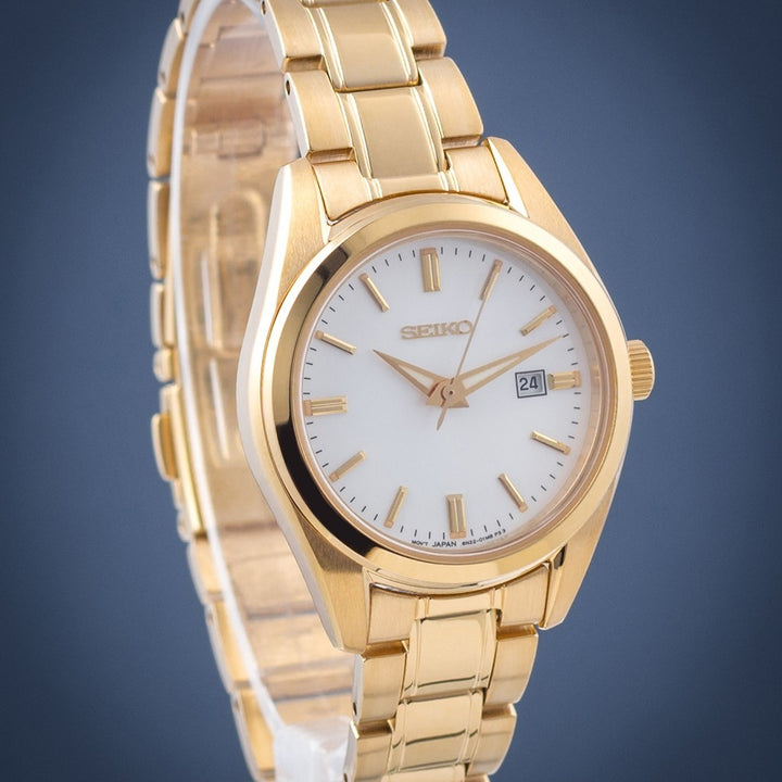 Gold-tone stainless steel case and bracelet. Fixed gold-tone stainless steel bezel. Silver dial with luminous gold-tone hands and index hour markers. Minute markers around the outer rim. Dial Type: Analog. Luminescent hands. Date display at the 3 o'clock position. Seiko caliber 6N22 quartz movement. Scratch resistant sapphire crystal. Pull / push crown. Solid case back. Round case shape. Case size: 29.8 mm. Case thickness: 8.3 mm. Band width: 14 mm. Fold over clasp with a push button release. Water resistant at 100 meters / 330 feet. Functions: date, hour, minute, second. Neo Classic Series. Casual watch style. Watch label: Japan Movt. Seiko Neo Classic Quartz Silver Dial Ladies Watch SUR632P1.